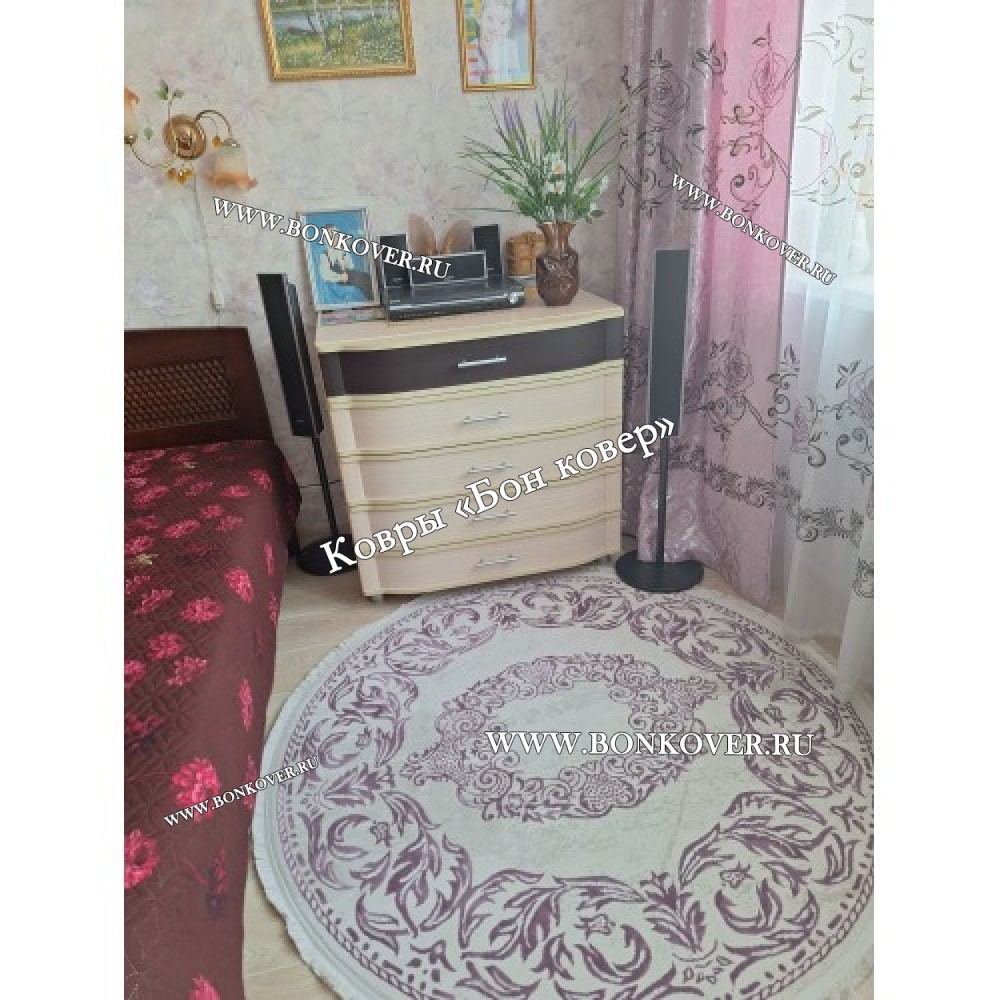 Ковер Турция Для Гостиной Дизайн 94 Сиреневый Круг станет привлекательным дополнением интерьера, оформленного в современном или классическом стиле. Мягкое, но прочное, ковровое покрытие обеспечивает тепло- и шумоизоляцию, отличается длительным периодом эксплуатации, надежностью, экологичностью и высокой износостойкостью, является отличной защитой от повышенной влажности в помещении и утеплителем для холодного пола. Благодаря качеству материалов, ковер не деформируется, сохраняет первоначальный вид под тяжестью предметов мебели. За его поверхностью легко ухаживать.
