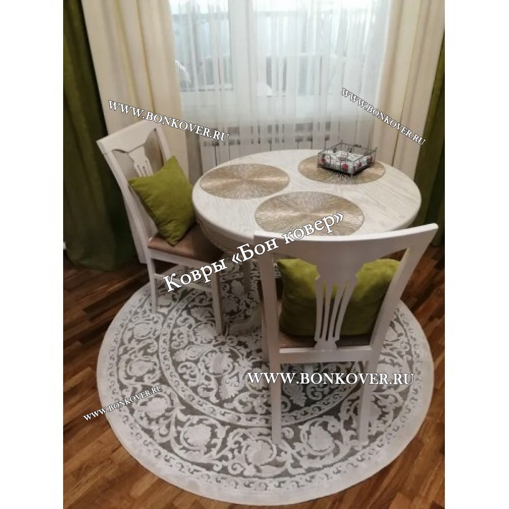 Шикарный Круглый Белый Шелковистый Ковер Дизайн 30542 наполняет интерьер гостиной теплом и уютом, гармонично сочетает в себе изящество и стиль. Он изготовлен из современных материалов, комфортный и долговечный.